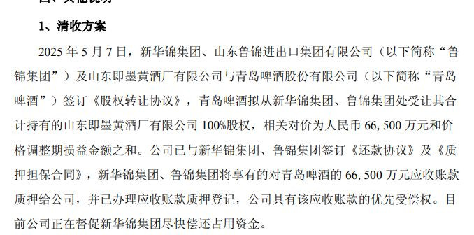 新华锦称,同样是在5月,公司已与新华锦集团、鲁锦集团签订《还款协议》及《质押担保合同》,新华锦集团、鲁锦集团将享有的对青岛啤酒的6.65亿元应收账款质押给上市公司,并已办理应收账款质押登记,公司拥有该应收账款的优先受偿权。目前上市公司正在督促新华锦集团尽快偿还占用资金。