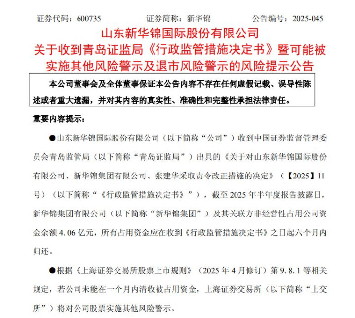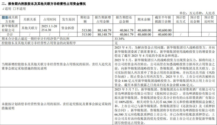从公告来看,新华锦集团及其关联方非经营性占用上市公司资金,占用时间为2025年1月1日到2025年6月30日;但如今,截至2025年半年度报告披露日,占用资金余额仍有4.06亿元未还。