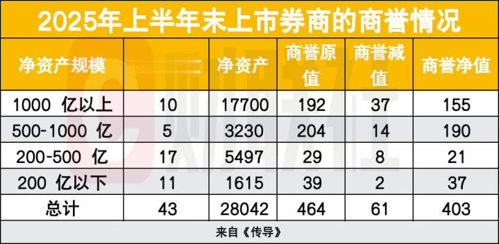 数据显示,截至2025年上半年,43家上市券商商誉总额达403亿元,其中中型券商商誉占净资产比例高达5.9%,远超行业均值。伴随着行业并购规模的日益扩大,商誉同步攀升,《传导》的观点在于,一旦这种“整体可控、局部集中”的结构性风险一旦爆发,极易引发单家机构业绩变脸,进而传导至市场,还会误导投资者决策。